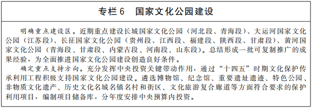 推進(jìn)國家文化公園建設(shè),生動(dòng)呈現(xiàn)中華文化的獨(dú)特創(chuàng)造、價(jià)值理念和鮮明特色,樹立和突出各民族共享的中華文化符號和中華民族形象,探索新時(shí)代文物和文化資源保護(hù)傳承利用新路徑,把國家文化公園建設(shè)成為傳承中華文明的歷史文化走廊、中華民族共同精神家園、提升人民生活品質(zhì)的文化和旅游體驗(yàn)空間。加快建設(shè)長城、大運(yùn)河、長征、黃河等國家文化公園,整合具有突出意義、重要影響、重大主題的文物和文化資源,重點(diǎn)建設(shè)管控保護(hù)、主題展示、文旅融合、傳統(tǒng)利用四類主體功能區(qū),實(shí)施保護(hù)傳承、研究發(fā)掘、環(huán)境配套、文旅融合、數(shù)字再現(xiàn)五大工程,突出“萬里長城”、“千年運(yùn)河”、“兩萬五千里長征”、“九曲黃河”整體辨識度。推進(jìn)優(yōu)質(zhì)文化旅游資源一體化開發(fā),科學(xué)規(guī)劃、開發(fā)文化旅游產(chǎn)品和商品。推出參觀游覽聯(lián)程聯(lián)運(yùn)經(jīng)典線路,開展整體品牌塑造和營銷推介。